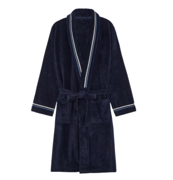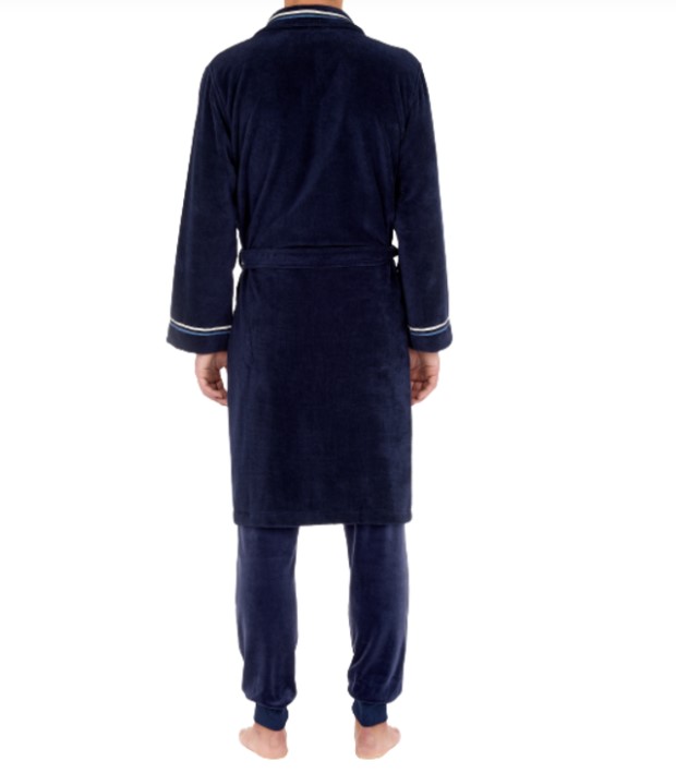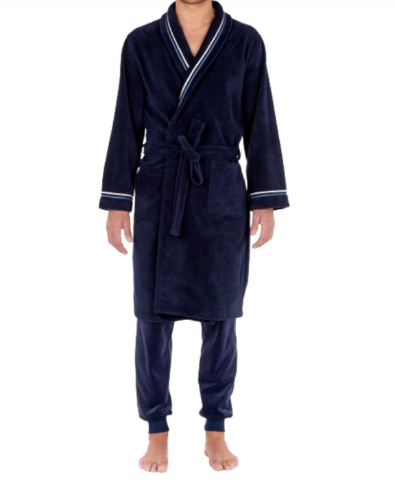 The TRANSAT men's bathrobe is a long, straight-cut, navy blue bathrobe. Particularly comfortable and soft, this bathrobe has a rather sophisticated style, even worn casually, over pajamas or loungewear. The sobriety of the dark color is energized by light touches on the stripes highlighting the collar and the edge of the long sleeves. This men's bathrobe is made of 90% cotton, 10% polyester.