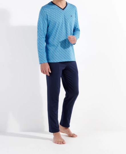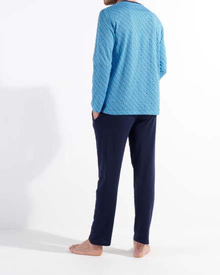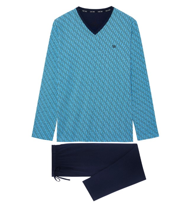 The CAMERON pajamas are a set consisting of a long-sleeved t-shirt and pants, in cotton, jersey knit. Smart and whimsical, it combines azure blue, navy blue and yellow in an \"art deco-inspired\" aesthetic. The print is featured on the pajama bottoms in contrast to the plain navy blue top, with turquoise blue details (logo, piping on collar and sleeves).
